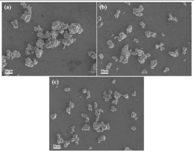 Mg2Ni合金顆粒呈現(xiàn)凹凸不平的形狀和粗糙的表面織構(gòu)。圖2(a)表明顆粒團聚和融合明顯,粒徑分布不均勻,超過10μm的顆粒普遍存在。這主要是由于球磨過程中韌性組分、鎂元素、分層和粘結(jié)造成的。球磨機的頻繁沖擊導(dǎo)致材料不斷破碎,少量的MWCNTs不能提供足夠的潤滑,導(dǎo)致顆粒尺寸變大。隨著MWCNTs用量的增加,其提供潤滑的作用更加明顯。粉末顆粒尺寸減小,團聚和焊合現(xiàn)象的發(fā)生減少。這表明摻入MWCNTs可以有效地減少團聚和融合的發(fā)生。
