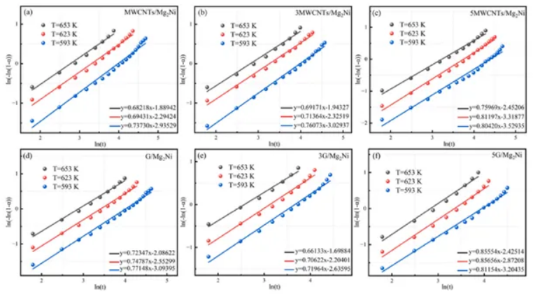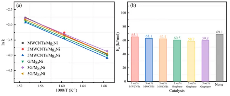 MWCNTs和石墨烯的結(jié)合有效地降低了Mg2Ni合金放氫反應(yīng)所需的活化能,從而提高了放氫動力學(xué)效率。特別值得注意的是,在3wt%石墨烯復(fù)合材料中,激活能最低為58.7kJ/mol,與Mg2Ni合金相比降低了約10kJ/mol。這突出了合金放氫動力學(xué)最有效的增強。